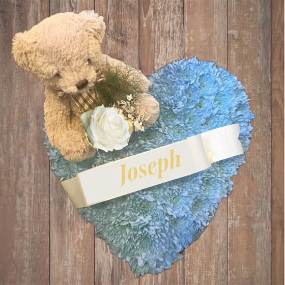 Our Baby Heart Tribute is a loving floral arrangement designed to honour the memory of a precious baby. A heart-shaped display of delicate flowers is accompanied by a soft teddy bear holding a single rose and a ribbon with wording of your choice (add below) This tribute provides a comforting and symbolic gesture of sympathy.