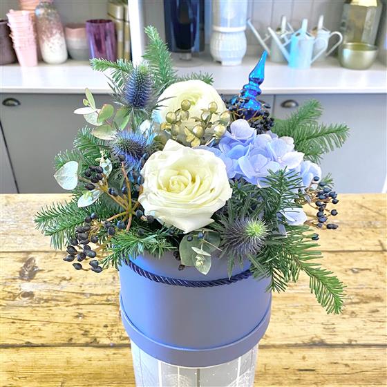 Our medium Silent Night hat box has blue hydrangea, white rose and ranunculus, blue viburnam berry and wintery blue thistle, Gold touches of hypericum and Christmas baubles, fresh and fragrant eucalyptus and pine foliages.