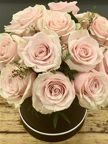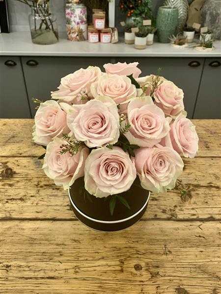 Modern hatbox design filled with twelve premium roses accented with touches of waxflower to create a stunning display. We are using Pink Mondial roses from Ecuador. These are a strong and beautiful roses that unfold gloriously over a few days.