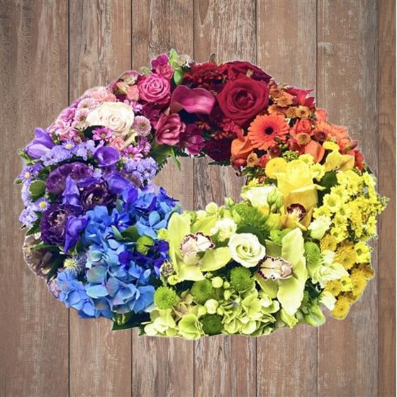 A vibrant and unforgettable tribute. Our epic rainbow style funeral wreath is crafted with the very best flowers, creating a stunning rainbow of colour. This grand wreath offers a unique and beautiful farewell.