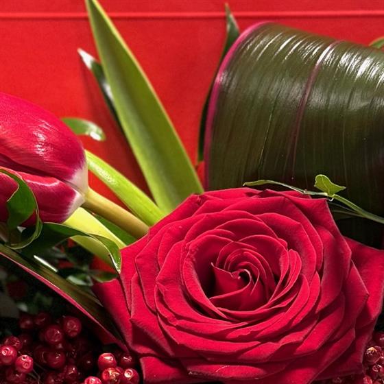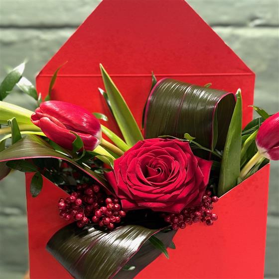 There is something timeless about a handwritten note, and SWALK (sealed with a loving kiss) captures that sentiment in a breathtaking floral display. Designed as a modern alternative to the standard bouquet. At its heart, a deep velvet red rose takes centre stage, surrounded by the elegant curves of fresh tulips and the structural beauty of glossy, architectural greenery.