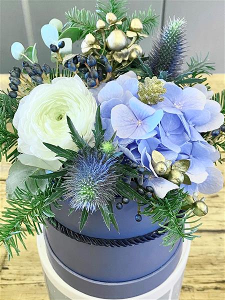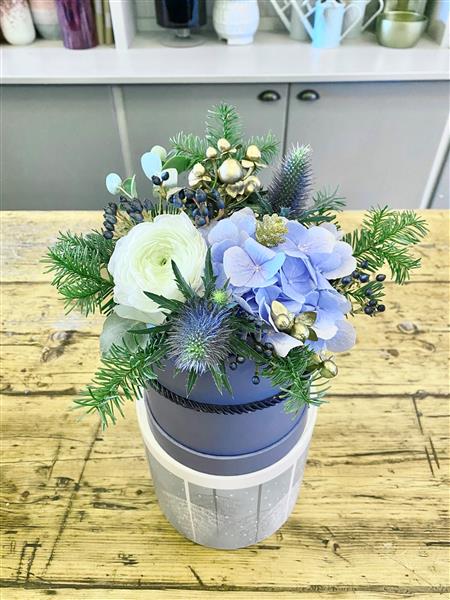 Our smallest Silent Night Hat Box has blue hydrangea, wintery thistle, gold hypericum berry, deep blue viburnam and fragrant Christmas folaiges.