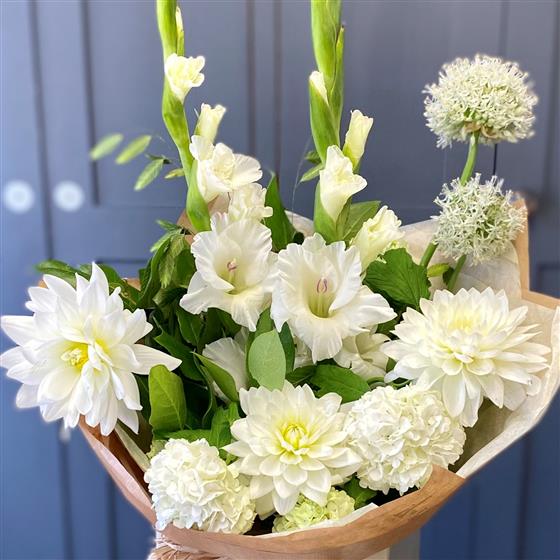 Creamy, soft blooms in this pretty summer bouquet with flowers such as gladioli, dahlia, viburnum and white allium.