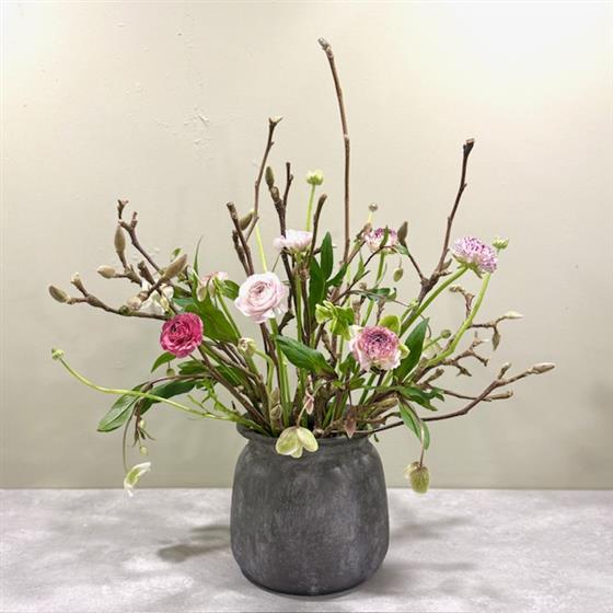 Nature isn’t meant to be tamed; it’s meant to be framed. Wild Intention celebrates the beautiful contradiction of the natural world. Featuring delicate ranunculus and hellebores that seem to "float" amidst a structural web of reaching Magnolia spring branches, this piece brings the untamed spirit of the forest floor into the heart of your home. Housed in a hand-finished, dark stoneware vessel that grounds the airy display, it is a reminder that there is power in both growth and stillness.